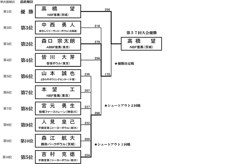 一般男子の部は予選を7位、準決勝を1位で通過した、中学生の高橋望選手(NBF推薦)と予選を1位、準決勝を3位で通過し、シュートアウト2回戦で279ピン-266ピンのハイスコア対決を制した森口宗太朗選手(ABBF推薦)の親子ほど年齢差のある決勝戦となりました。