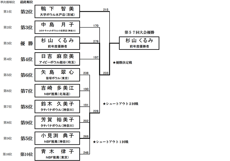 一般女子の部は予選を2位、準決勝を1位で通過をした鴨下智美選手(茨城・大学ボウル水戸店)と、予選、準決勝ともに3位で通過し、シュートアウト2回戦を279ピンというハイスコアで勝抜いた、杉山くるみ選手(前年優勝者/神奈川・江の島ボウリングセンター)の奇しくも昨年度第56回大会と全く同じ対戦となりました。大会2連覇を狙う高校生になった杉山くるみ選手、一方は昨年のリベンジに燃える、鴨下智美選手と非常に見ごたえのある決勝戦となりました。