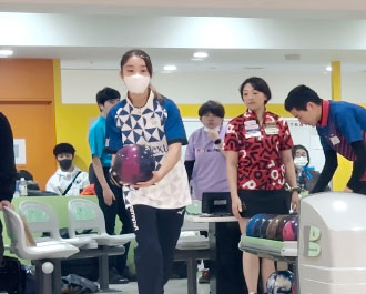 障害者の部は、今年も昨年に引き続き、感染対策として、参加人数を定員の6割ほどに減員しての開催となりました。プロボウラーによる「ボウリングクリニック(教室)」に始まり、「スカッチトリオ戦」、「個人戦」と進み、「スカッチトリオ戦」においては、参加選手と引率の皆様がプロボウラーと投球し、コミュニケーションを深めました。瑶子女王殿下も個人戦を、説明役の武田会長の先導で、間、プロボウラーからのご説明にもお耳を傾けられ、熱心にご視察され、温かな眼差しとお言葉を参加者に掛けられていました。